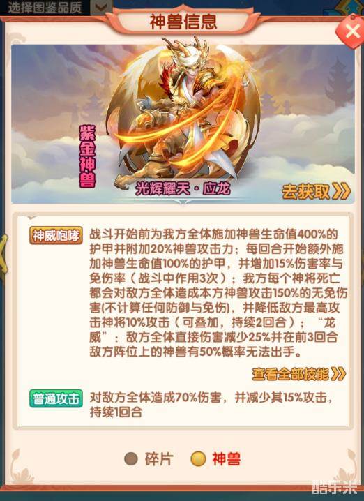 光辉耀天·应龙不仅拥有强大的技能属性,它还拥有紫金神兽的两大特色养成系统——神兽化身和神兽法术。在化身系统中,玩家可根据阵容需要,为紫金神兽定制三只金色神兽化身,从而开启化身技能,这将极大提升紫金神兽的战斗能力。此外,玩家还可为紫金神兽装备法术书,激活上阵神将的法术奥秘,为神兽提供额外的属性加成。
