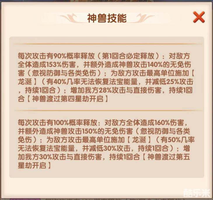 应龙每次攻击时,都有较大概率对敌方全体造成群体伤害加上自身攻击百分比的无免伤害并增加我方全体的攻击力和直接伤害。同时在应龙升至三星之后,还能解锁“龙涎”来封锁敌方攻击最高神将的法宝能量恢复。