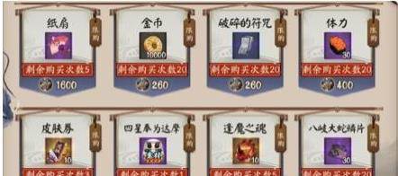 上面如果说勾玉兑换一些奖励以加强自己练度,那么再说一点,在第二点介绍中的秘境,每次进入需要一个卷轴,秘境开启需要秘境卷轴,卷轴可以从每日任务获得,再者就是50勾玉购买,之后每次叠加25勾玉,大概就是勾玉换体力、金币、觉醒材料、御魂狗粮和活动货币。每日凌晨刷新购买价格。具体介绍看第二点中介绍。