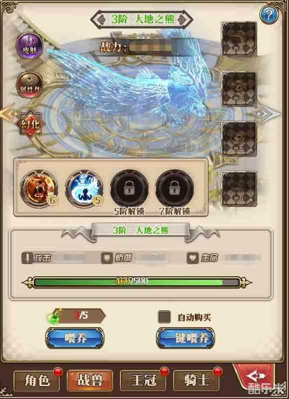 当玩家把战兽经验进度条喂满后,战兽就会自动进阶。战兽进阶成功后将为玩家解锁新的战兽皮肤和战兽技能,并提供大量的战兽属性提升。战兽在每一个阶段都会有不同的形态,想要好看的战兽?这就要靠各位玩家的培养来解锁了!战兽装备在开服第6天,并且玩家的骑士等级达到1阶即可开启战兽装备功能。战兽装备品质分为绿,蓝,紫,橙及红五中,共分为12阶,穿戴要求为≥战兽阶数。多余的战兽装备可用于强化战兽装备部位。