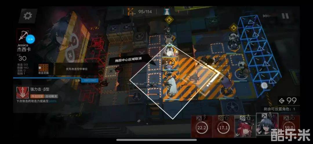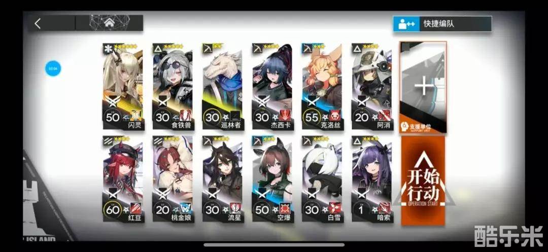 本关阵容方面,尽量用一个高练度单奶。图中所有四星干员仅杰西卡携带一技能,其余干员均携带二技能,所有干员技能7级。