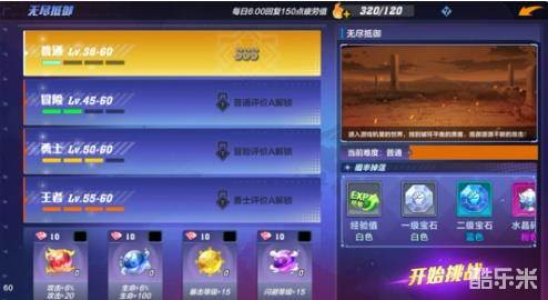 玩家等级到达38级时可以解锁活动副本“无尽抵御”,可从活动选项中选择进入副本,副本分为普通、冒险、勇士、王者四个等级,每一个难度评价到达A以上时则可以解锁下一难度副本,难度越高的副本也会有更多的阶段(普通级只有一个阶段),副本奖励当然也会随着难度的提升而提升。