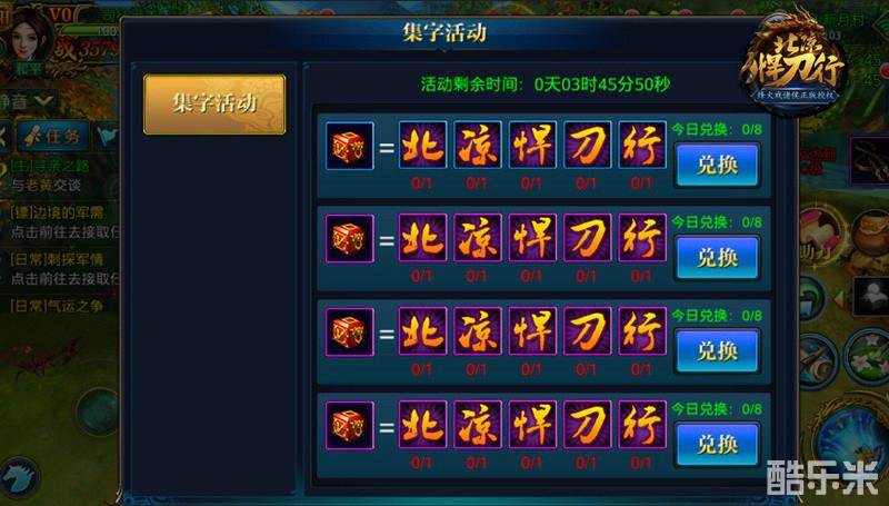 《北凉悍刀行》开启全新兑换活动,收集道具可兑换珍稀道具,新时装,新称号应有尽有,更有各种限量道具,不要错过哦!全新推出的神秘道具将可以兑换各色珍稀道具,那些平时可望而不可即的珍贵物品、那些只有土豪才能占据的神兵法宝、那些曾经级数太低而丢掉的遗憾,现在统统找回来!满足你的收集欲望,只要攒够神秘道具,即可兑换珍稀物品,公测版本坐等战力起飞!