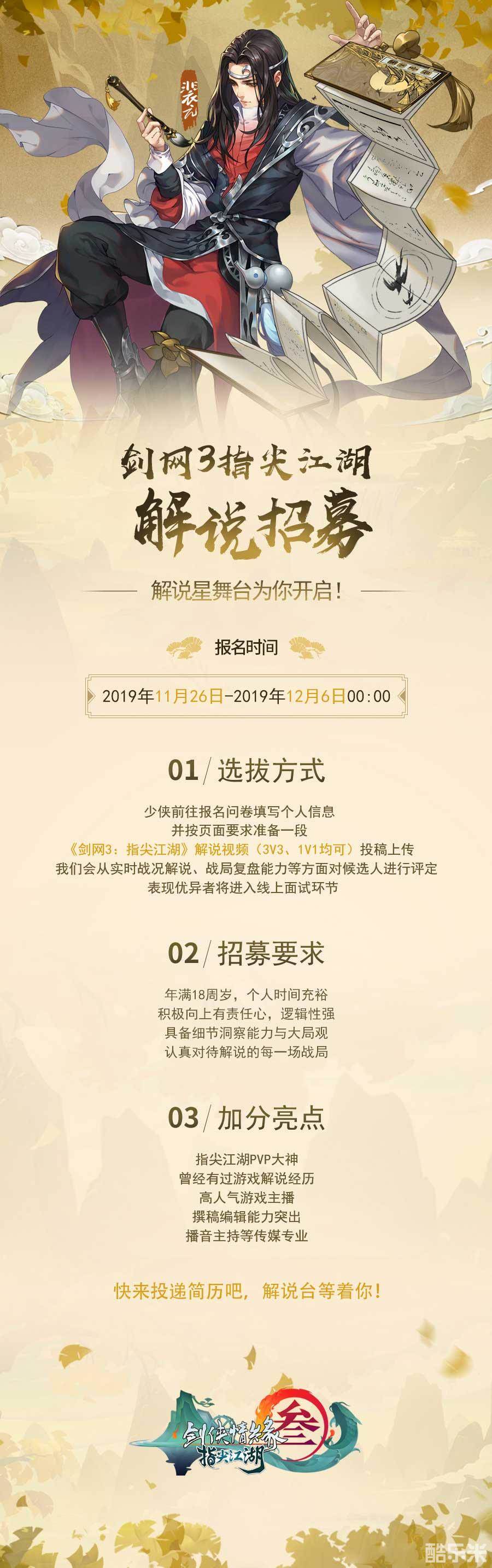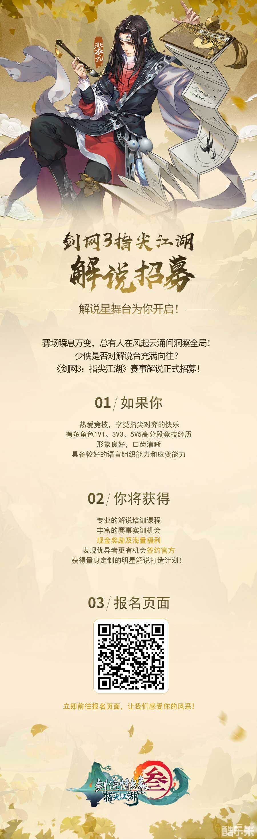 《剑网3:指尖江湖》官方解说招募开启!无论少侠是侃侃而谈的相声型选手,还是笔落生花写得一手好文的战报大神,只要你能在解说台纵观全局,带领观众沉浸对弈当中,欢迎各路少侠前往报名!