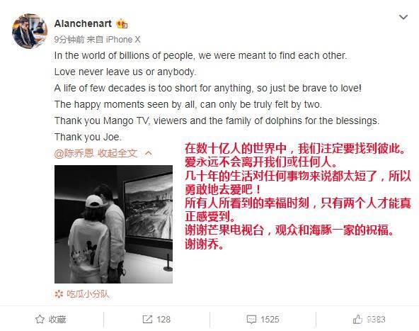 这次官宣了,证明了两人并不是节目效果,是真的在一起了~之前节目一直被质疑是剧本有台词,现在本人出来回应,祝福陈乔恩艾伦❤️