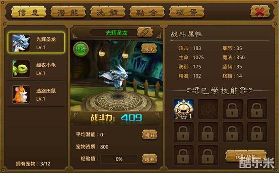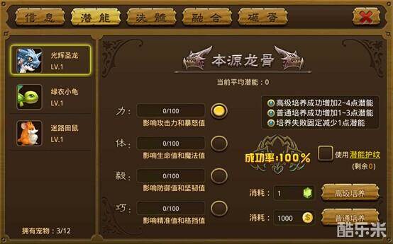 潜能:在潜能页面可以提升宠物的潜能,可以大大提高宠物的属性。提升潜能有两种方式“普通培养”和“高级培养”,高级培养成功可加2~4点,普通培养成功加1~3点,培养失败会减少1点。