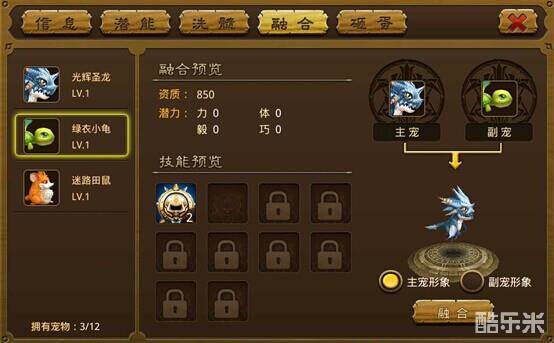 融合:可以将两只宠物进行融合,融合后的宠物会继承最高的等级和潜能属性,并且将两只宠物的技能进行合并,玩家可以随意选择融合后的宠物的形象。