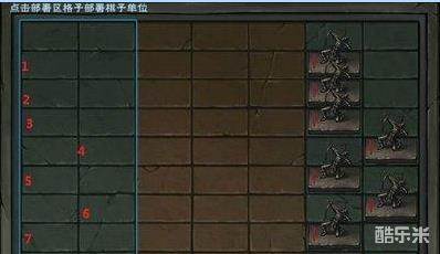这张图上全是弓箭兵,只要和对面错开放弓兵就行了,就是上图中标上数字的格子,或者将对面的站位复制过来,但把兵种换成步兵即可。当然由于对面的分数会比你多两点,所以可以空一个,但最后总分还是会是你高。