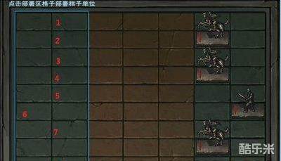 如图最下面的敌方骑兵可用在7和8两个位置放弓兵实现零换一。但在上放以为两个骑兵站的比较近,之前的方法就无法使用,有时也有骑兵旁边还有其他兵种的情况,这种时候通用的方法是在4放一个步兵,5放一个弓兵送掉步兵让弓兵杀死骑兵,步兵的话直接负责对面站位就行上图就是6位置放步兵当然由于分数问题上图6位置可以不放棋子,5和7杀完骑兵会顺手收到步兵,这里只是用一张图解释遇到其他局面要如何解决。