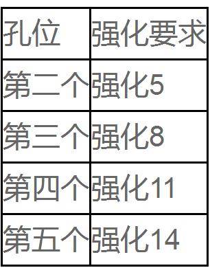 2、每件装备有默认的一个宝石孔,其他4个宝石孔是需要强化来开启的,开孔规则如下。