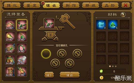 在右下角的功能栏里面点“铁匠铺”可以打开装备镶嵌功能。