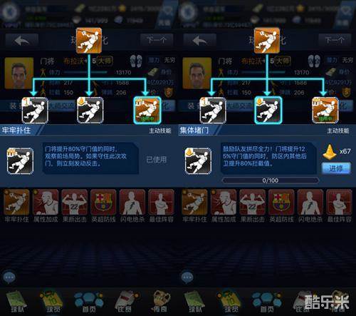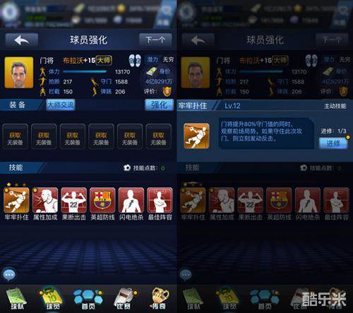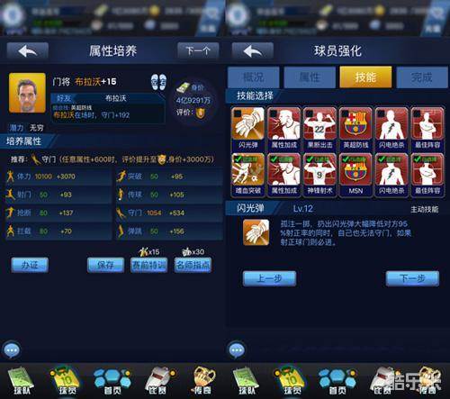 在属性强化方面,体力与守门永远是最优选择。就算你的门将和诺伊尔一样有一颗技能的心,也只能安心的在门线前力保你的球门不失。同时,考虑到中场时需要替换第二门将上场的问题,所以在游戏前期需着重注意上半场派出拥有“闪电战”的门将、下半场换为“绝杀”门将。虽然这一点在大师交流为“闪电绝杀”与“最佳阵容”后便失去意义,但为了能够获得比赛的最终胜利,任何细节都不能错过!