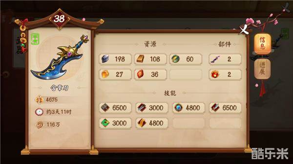 等级为38级的含章刀,就是其中的一员,它隶属于武器中的刀类,制造所需资源为铁矿、铜、油、宝石和辰砂。制造所需部件为28级无暇品质玄铁大环刀与19级制造材料离火珠,另外所需要锻造、木工、天文、兵器制作、治玉和阵符这六项技能。其专属技能为摸金校尉(初级),作用是能使武将自身探索获得资源最小数量+1,图纸可通过使用摸金符玉这一途径抽取。