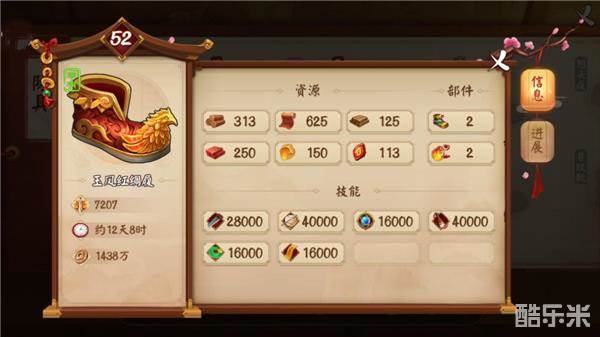 最后让我们将目光锁定在防具上,装备等级为52级的玉凤红绸履尤为出色,其制造所需资源为木材、皮革、硬木、布料、宝石和辰砂。制造所需部件为44级嵌金绿绸靴,28级制造材料琉璃天火,制造所需技能有木工、纺织、天文、染色、治玉和阵符。其专属技能为摸金校尉(初),作用是使武将自身探索获得资源最小数量+1,图纸可通过运营活动获取。