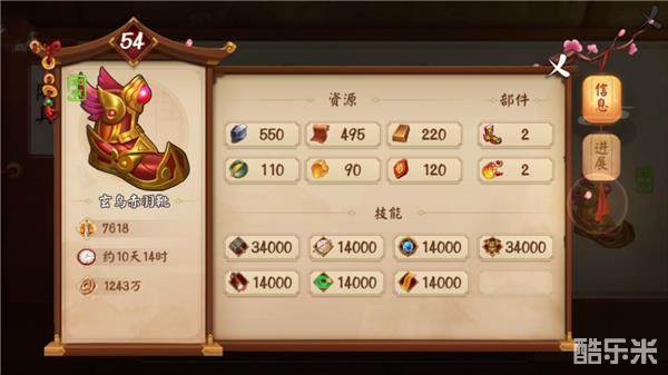 另外,这件54级的玄鸟赤羽靴也不妨多让,其制造所需资源为矿石、皮革、铜、油、宝石 和辰砂,制造所需部件为46级浑阳锁金靴,28级制造材料琉璃天火。制造所需技能有锻造、纺织、天文、甲胄制作、染色、治玉和阵符。其专属技能为不虚此行(初),作用是使全队武将探索获得资源最小数量+1,图纸可通过运营活动所获取。