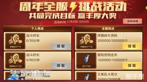 活动主要分为个人挑战和全服挑战两个部分。主要挑战内容包含战斗时长、爆头击杀数、神器碎片消耗、冒险怪物击杀、金币消耗、武器升星、军火库英雄武器获取等多个项目。而通过完成个人目标和全服目标,玩家可以轻松从中获得挑战宝箱;海量神器碎片、神器原石以及英雄武器合成碎片等高品质奖励唾手可得!
