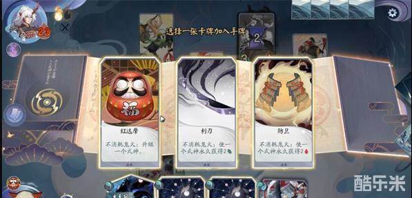 “红达摩”可以给我们的式神升级,“利刃”使一个式神永久获得+力量,“防卫”使一个式神永久获得+2生命,我们需要选择合适的卡牌来提升我们式神战斗力。
