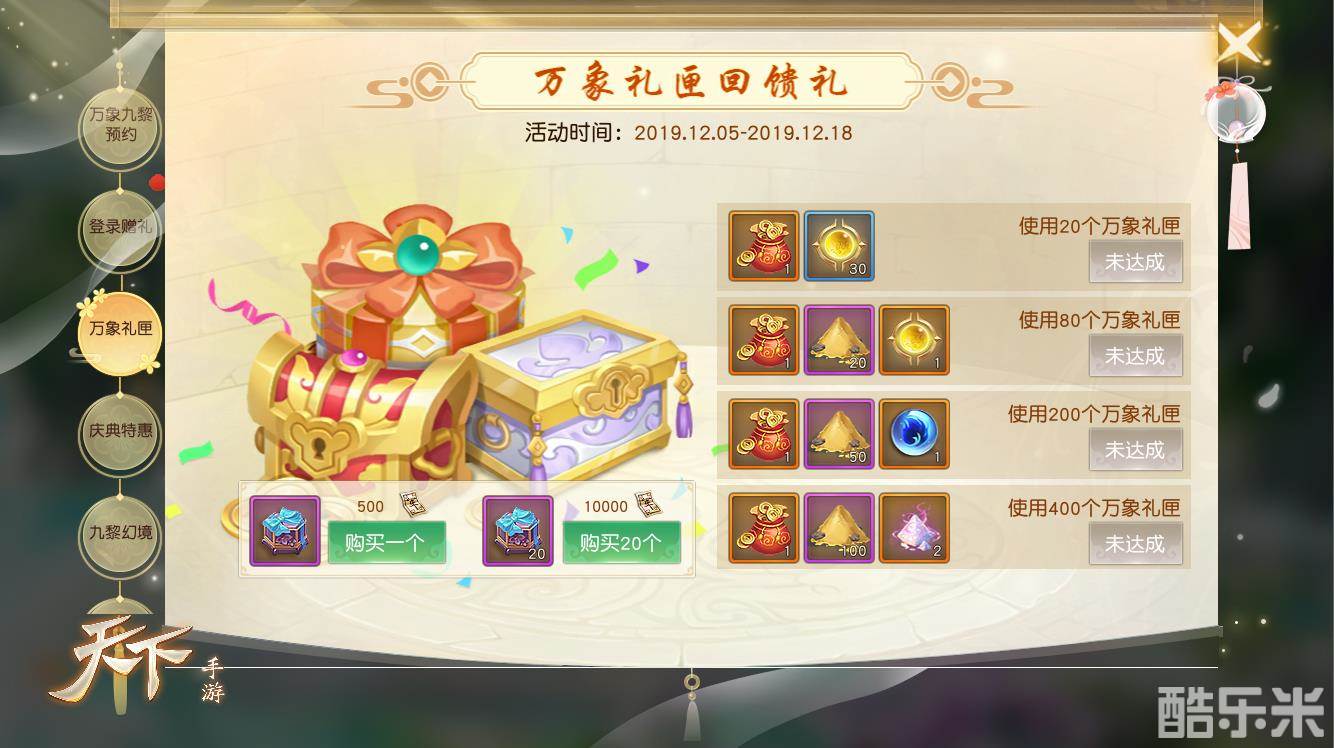 《天下》手游年末资料片专属福利拿到你手软!新版本预约即送头像框,累计登陆更可领取永久外观;全服活跃送豪礼,所有服务器的少侠一起瓜分千亿金币,双12还有更多巨划算充值返还与超值特惠活动等你了解!年度赠礼大回馈,海量军资任性送。今年最具诚意的福利,全在这里啦!