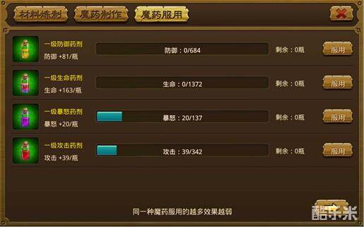 6.在“魔药服用中”每个NPC对应所能通过魔药增加的属性有上限,若想通过魔药提高更多的属性,需获得勋章解锁对应高等级的NPC来合成更高级的魔药。