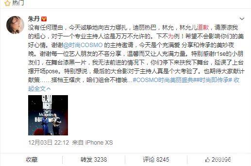 主持人朱丹在活动上把古力娜扎喊成迪丽热巴,对着林允喊允儿,林允儿也在场,口误连连引发争议。随后,朱丹发文道歉,“没有任何理由,请原谅我的粗心,对于一个专业主持人这是万万不允许的,下不为例!”
