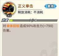 普攻:正义拳击。平淡无奇的普攻技能,没有任何附加效果,且攻击力系数也仅有90%。