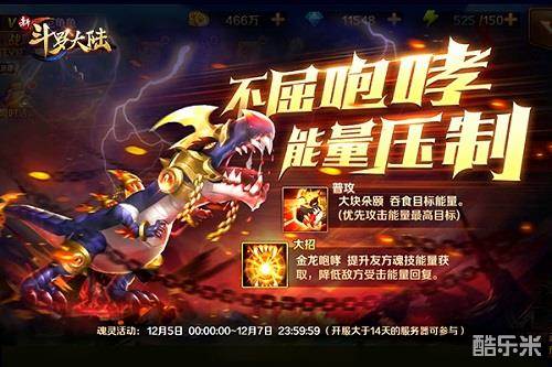 随着进入12月,《新斗罗大陆》手游也迎来了一波更新,此次更新将有极其稀有的不屈魂灵——霸王龙登场,下面快随小编一起来了解一下吧。