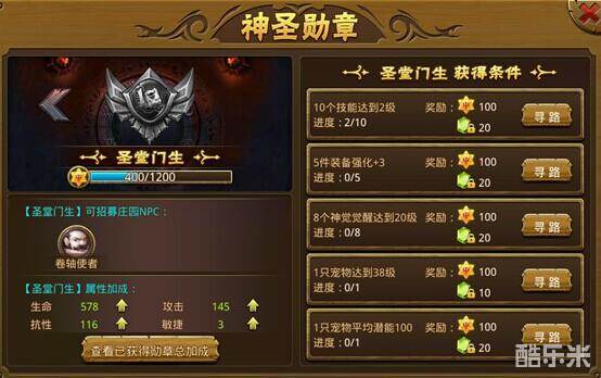 2.获得勋章后可开启下一个勋章,并且若不知道如何完某个勋章的某个条件可点击寻路按钮找到对应完成的方法。