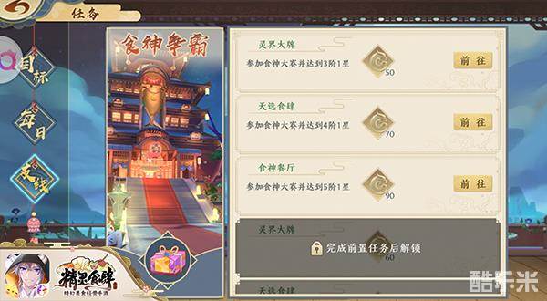 精灵食肆的支线任务中奖励设置相当细致,指引店长们在食神争霸和温泉经营中不断取得新成就,在食神争霸支线任务中,每一次餐厅等级晋升都会获得灵石作为奖励。