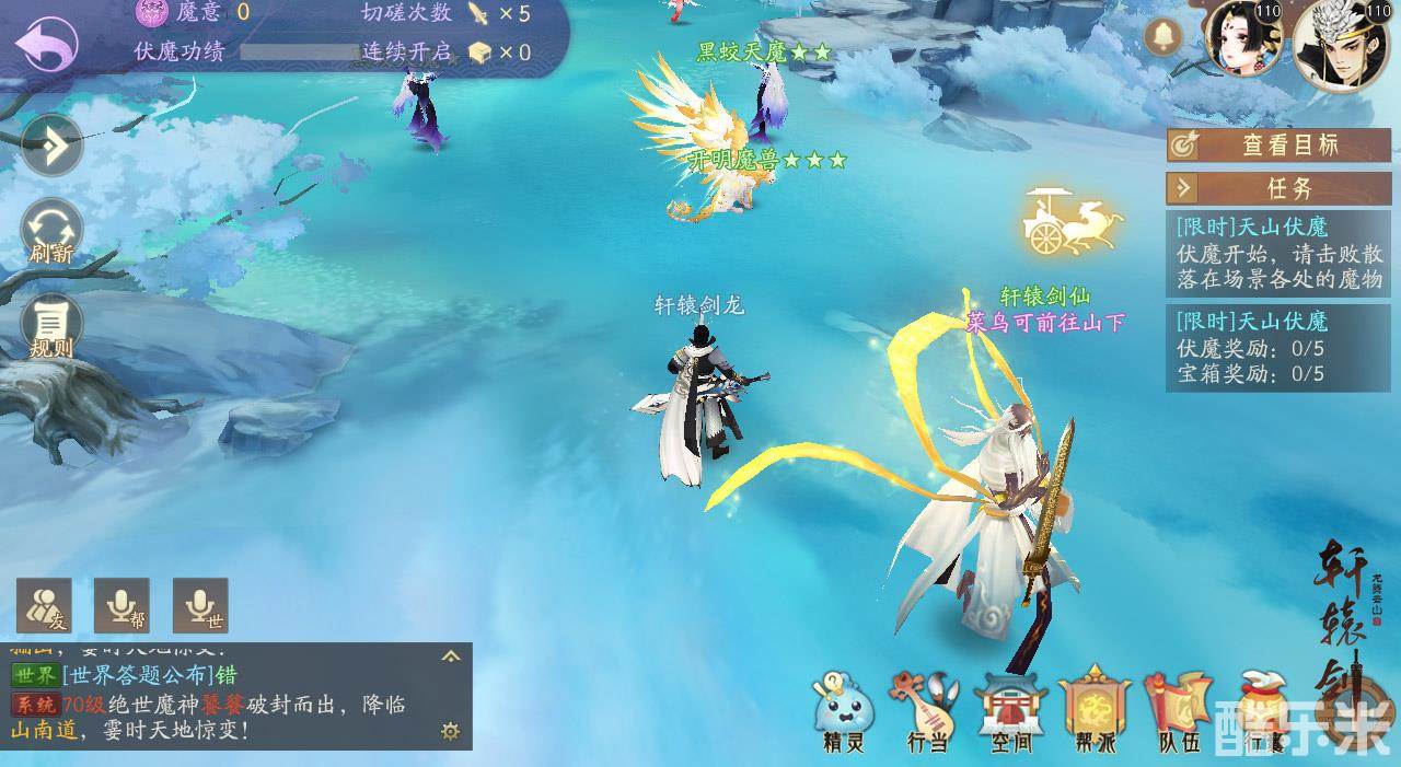 等级达到70级的少侠均可参与“天山伏魔”限时活动。活动开始后,场景中会出现一批魔物,击败可降低其体力,当魔物耗尽体力时会消失并留下宝藏。天山分为两处,分别是山脚下和天池,天池的魔物会更加强大,当然宝物也更加丰厚,侠士们可根据自己队伍的实力选择作战地点。
