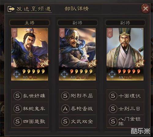分享一个对阵顶级蜀枪的战报,主要想表明曹操也能打出10000+输出。所以这队伍的特点就是后手速度慢,所以放弃控制,但是三个人都够肉,都能打。