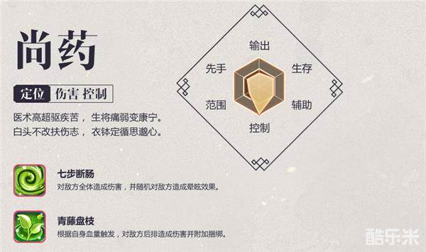 尚药属于输出兼控制型的职业,拥有一定的伤害和不俗的控制对方行动的能力。在战斗中,让对方的角色暂时无法行动,是一鼓作气击破对方,还是力挽狂澜,扭转局势都看在实战中你如何使他们了。