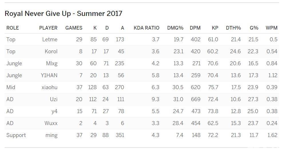RNG的ADC Uzi简自豪(20场比赛,9.3KDA,每分钟669伤害),毫无疑问是中国地区乃至整个召唤师峡谷(全球)历史上最伟大的选手之一。曾经在2013年和2014年连续两次带领队伍打入全球总决赛,尽管没有获得冠军,Uzi也至此声名鹊起。极具侵略性的打法、恐怖的线上统治力以及团战能力使得他在世界范围内可谓家喻户晓。但是来到中国的国内联赛,Uzi却没能像他在世界舞台上那样,拥有足够的统治力。到目前为止,Uzi从来没有获得过任何国内联赛的冠军,尽管他拥有世界赛最好的操作。队伍竭尽所能的配合他,不管他选什么英雄,都会围绕着他来建立阵容,并将大部分资源都让给他——整个夏季赛,他掌控着队伍最多的经济,占比为总经济的27.3%。