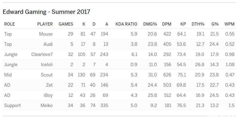 但这并不是说,RNG是完全由Uzi的表现来决定生死;中单小虎迄今为止的表现也相当出色,以30.5%输出占比紧随Uzi之后。在联赛早期的艰难时期,小虎用岩雀和蛇女carry了RNG。这帮助他在整个赛季拿下了高达12次的MVP,也使得他能与EDG一贯强大的中单Scout平分秋色。