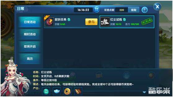 红尘试炼任务只要等级达到15级(通常20分钟内的新手也可以到达,基本可以说是没有门槛),就达到了做任务的最低标准啦。红尘试炼一般来说任务包括了五种模式,分别是:送信、寻仙、寻物、匪患、巡逻。