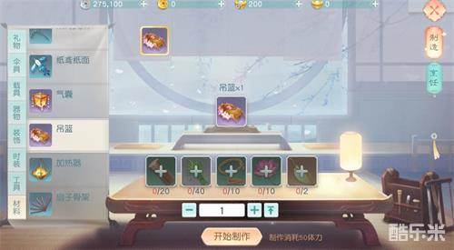 飞鸾翔凤的制作,需要三种材料,即吊篮、加热器以及气囊。其中,吊篮的制作配方为:20个桐木、40个茅草、10个绳子、10个荷花、2个金叶子,至于具体的材料入手途径,下文我们将详细的盘点。