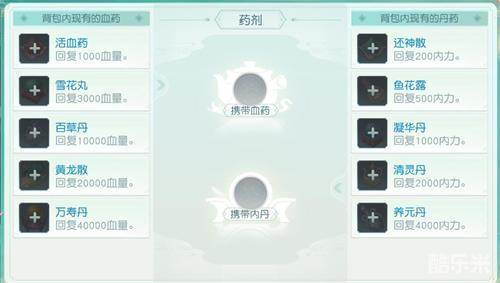 和血药类似,丹药也分为五种,具体是还神散、鱼花露、凝华丹、清灵丹、养元丹,其功效是增加内里,具体数目为200、500、1000、2000、4000,前者数据最低,后者最高,小伙伴们可以根据条件入手。