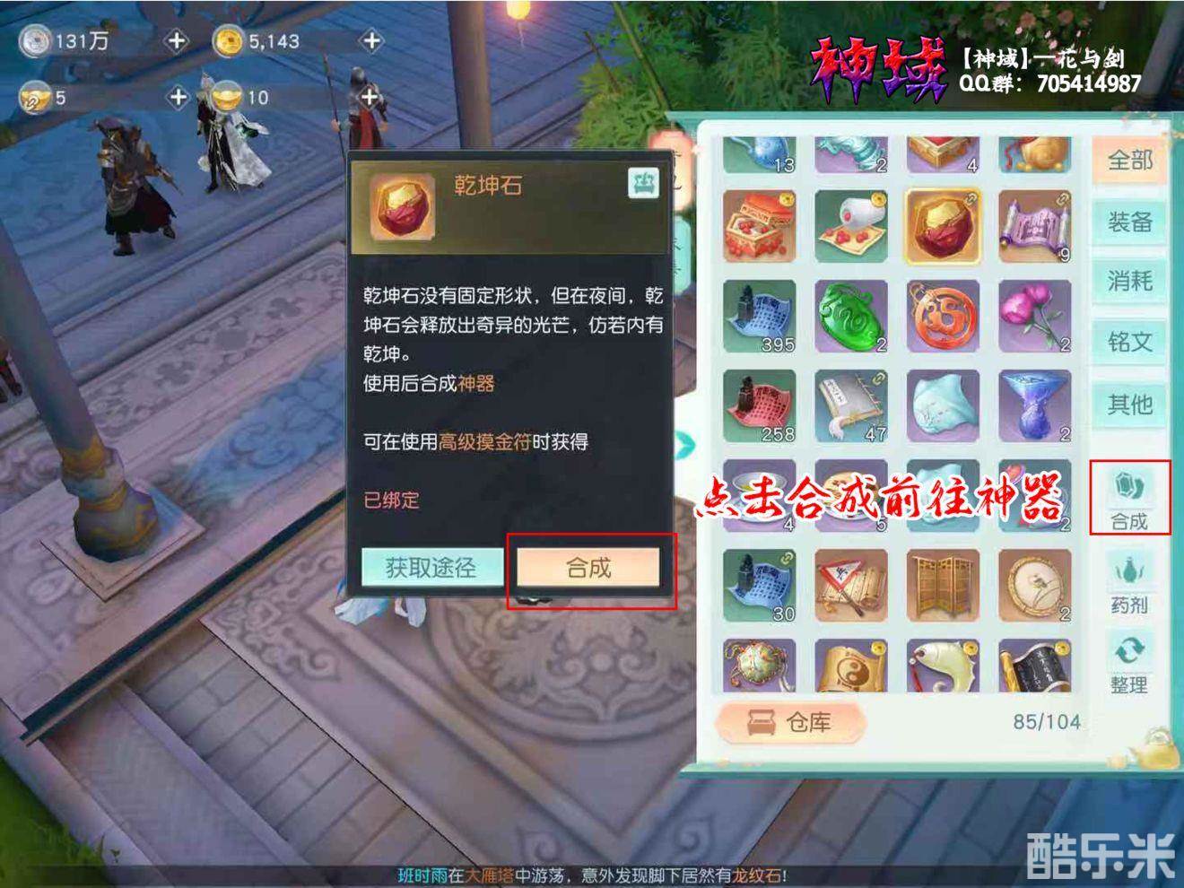 合成在背包里进入,背包的右下或者点击乾坤石都可以进入合成界面,合成的产出叫做神器,属性方面和神兵和神器差别其实不大,但是后期的提升几率不同,神器的进阶、升段、升星等等的几率都明显高于神兵,用神兵就要做好1星到死的准备。
