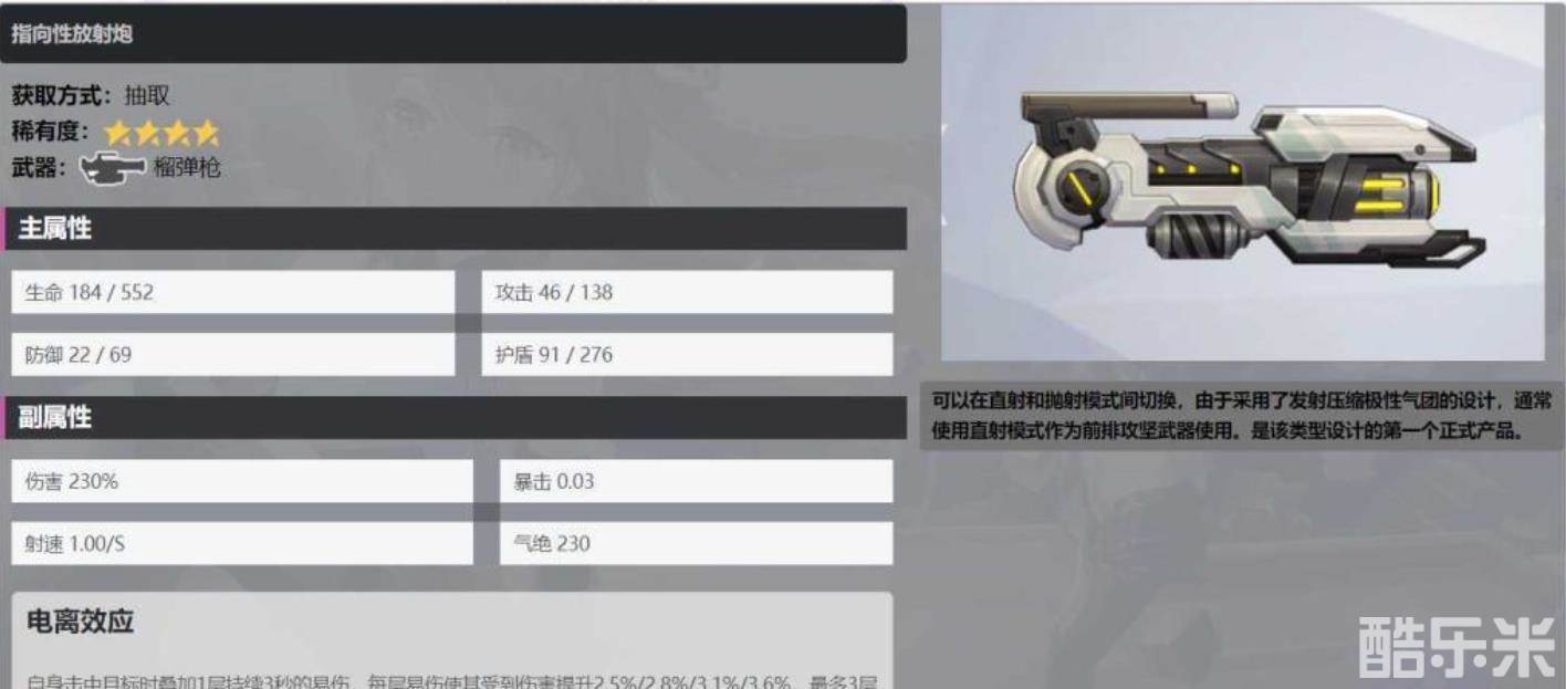 榴弹枪节奏榜中输出效率第一的枪,dsp约为226%,气绝率不如万圣节的妖精技能为电离效应,自身击中目标时叠加1层持续3秒的易伤,每层易伤使其受到伤害提升2.5%/2.8%/3.1%/3.6%,最多3层。