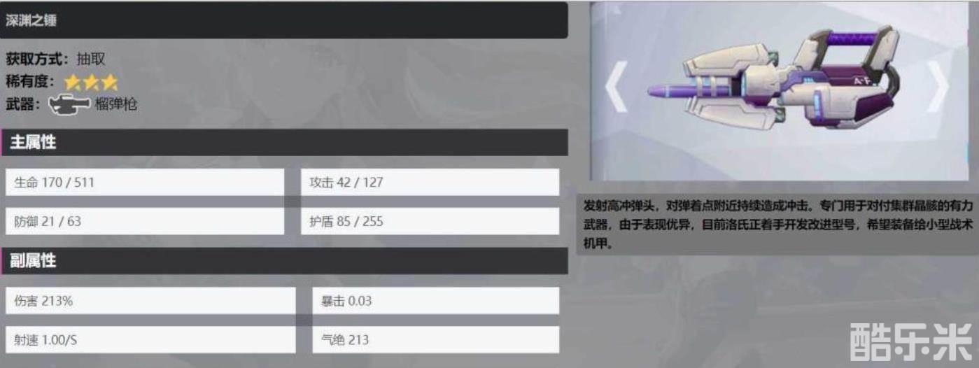 深渊之锤技能为爆冲榴弹,自身每命中5次,额外发射一发榴弹,对范围内造成50%伤害和189/210/231/273气绝伤害