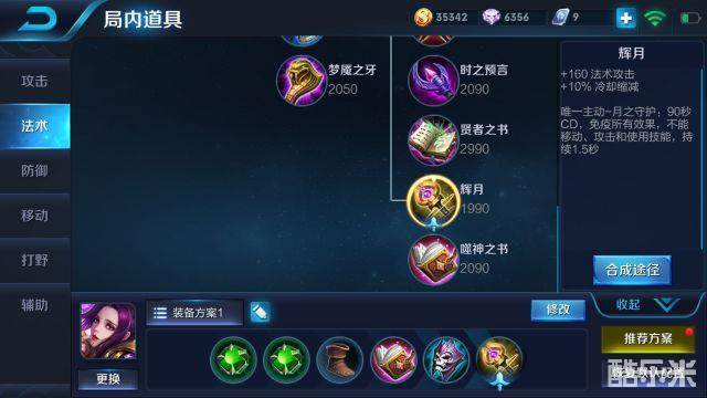 出装推荐:2个提神水晶出门,吸血书,面具,辉月,最后2件装备和鞋子看阵容和局势出,如果打野则出打野攻速刀。