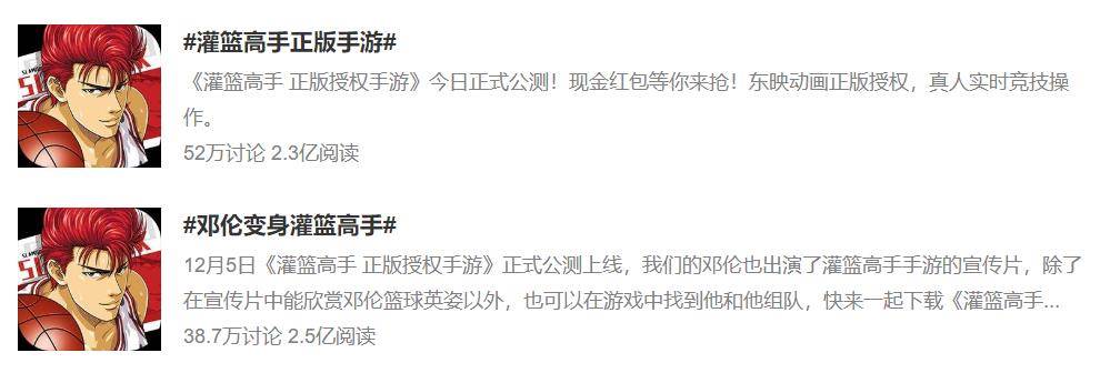 正因为双属性的完美契合,这对组合在微博产生了巨大的声量。包括#邓伦变身灌篮高手#、#邓伦灌篮高手#、#灌篮高手正版手游#等话题频频冲高,多次跻身微博热搜前列。与此同时,相关话题的讨论度也是不断上涨,光是#邓伦变身灌篮高手#的话题阅读量就超过了2.5亿。#灌篮高手正版手游#的话题阅读量也超过了2.3亿。这都得益于这次娱乐游戏的强势结合,《灌篮高手 正版授权手游》取得了开门红。