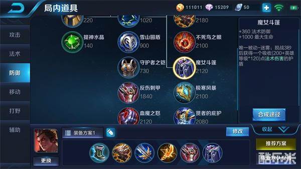 物理和法术防御兼备的出装,两件输出装备增加吕布的伤害能力,如果敌方阵容物理和法术伤害比较平衡,建议出这套装备来进行针对。