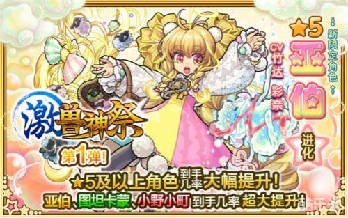 活动期间,新限定角色「★5 亚伯」的到手几率超大提升!并会以各项附加值(HP/攻击力/速度)全满(进化前)的状态扭出!