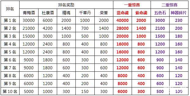 3. 活动期间累计消耗金币达到20000金币,可以额外领取一重惊喜奖励(蓝命魂,紫命魂);