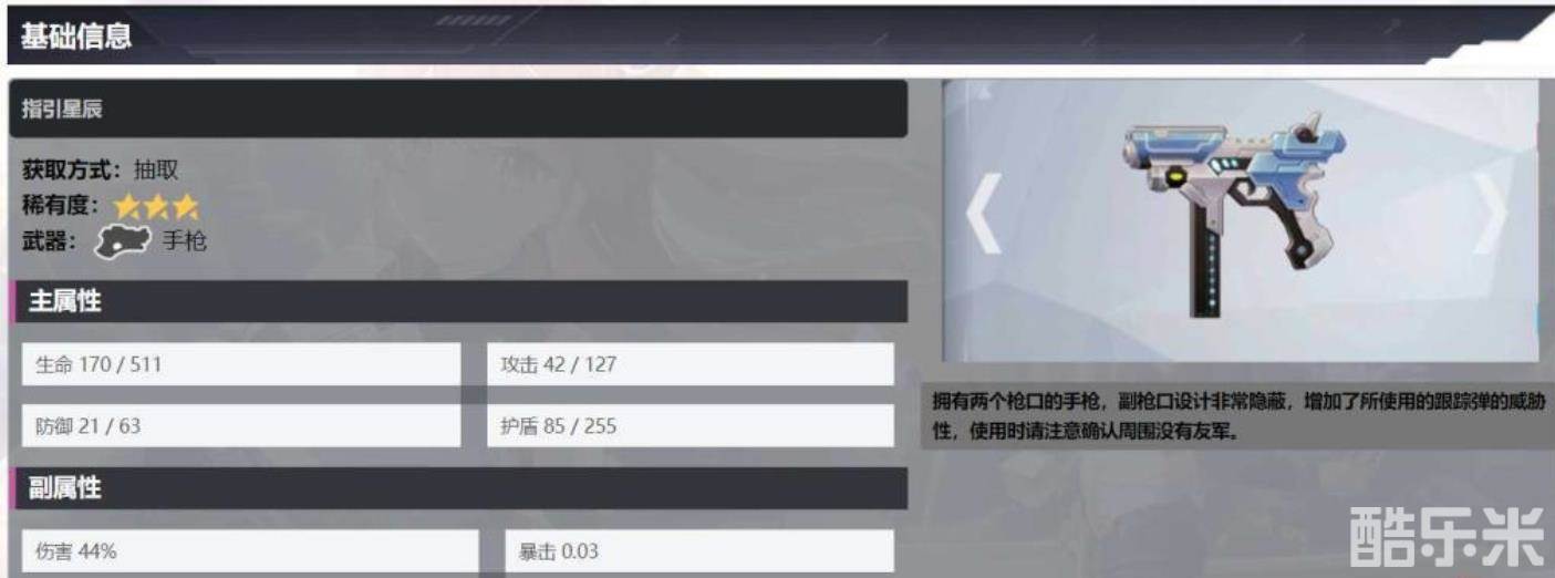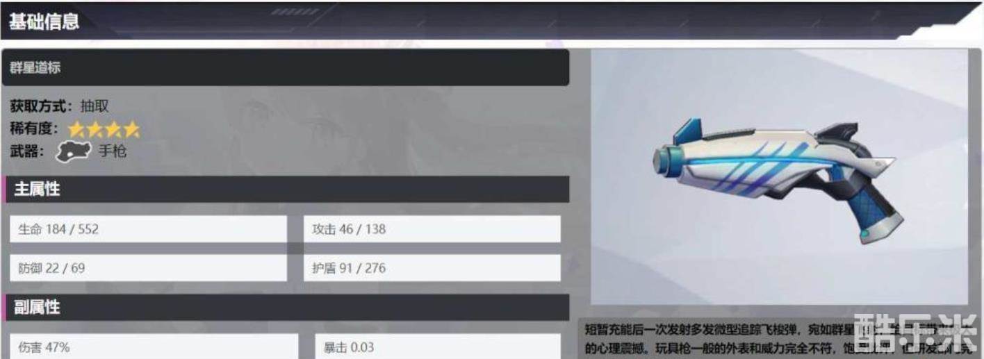 输出仅次于指引星辰,技能为星之所,向自身攻击命中时有10%几率射出10发微型追踪飞梭弹,每发造成33/37/41/48%伤害,触发间隔10秒。要注意的是群星道标是一把四星的高稀有度枪,获取难度和培育难度都比指引星辰高上不少,所以还是推荐指引星辰哦。