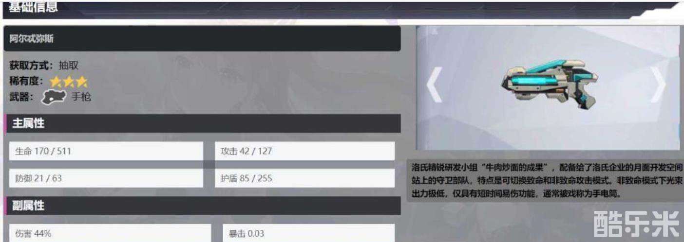 一把可以增加气绝伤害的三星手枪,技能为变焦照射,可以把自身造成的气绝伤害提高11.3%/12.5%/13.8%/16.3%