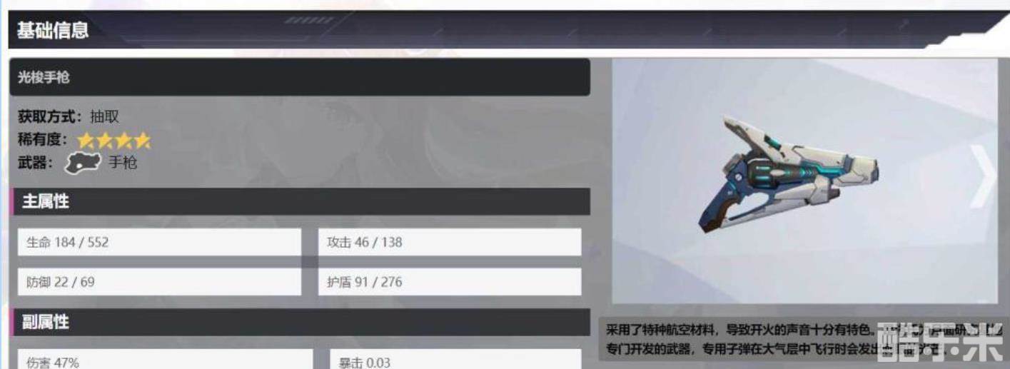 这把枪虽然只有三星,却是当之无愧的输出冠军。平均DPS为276.99%,平均气绝量为351.78全武器最高。它的技能是灵巧飞梭在每次射击追加射出1发智能化微型飞梭弹,可成造5%/5.5%/6.1%/7.2%的伤害。在这里强烈推荐大家在当前版本使用培养这把手枪!