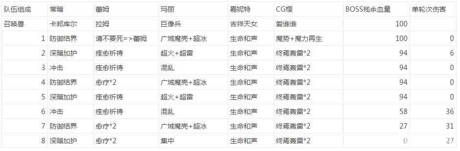 队伍组成常暗蕾姆玛丽嘉妮特CG樱BOSS残余血量单轮次伤害