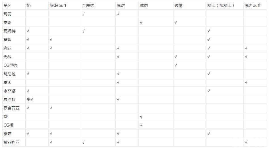 三种buff(减伤---常暗,CG樱等,魔抗---玛丽、光战、雷因等,全属抗性---玛丽、嘉妮特、敏菲利亚、卡邦库尔)加全,