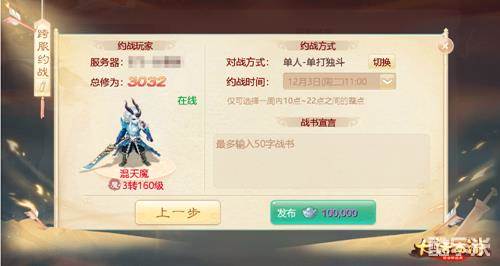 在地图下方这块锁链为栏,断剑环绕之地,便是举行“跨服约战”和“帮派擂台赛”的战场。在这里,玩家可以通过ID搜索寻找本服或者跨服的对手进行“跨服约战”,在选择单人约战或多人约战的比武模式后即可向对方下战书,并在对方接受挑战之后,在规定时间展开对决。参与比武的玩家还可以邀请自己的好友前来观战,观看的同时还能发送弹幕,为自己支持的一方加油助威。